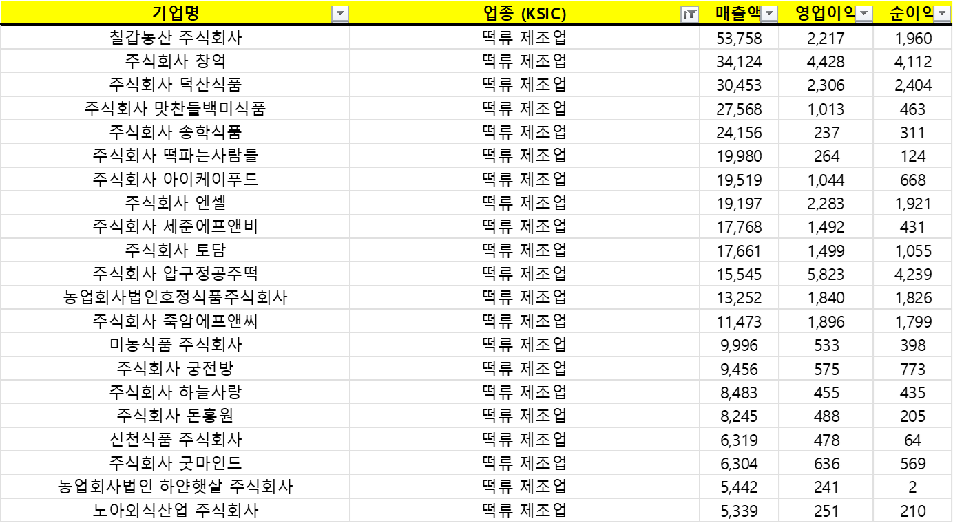 | 주식회사 밀앤스토리 | 떡류 제조업 | 4,096 | 187 | 163 |