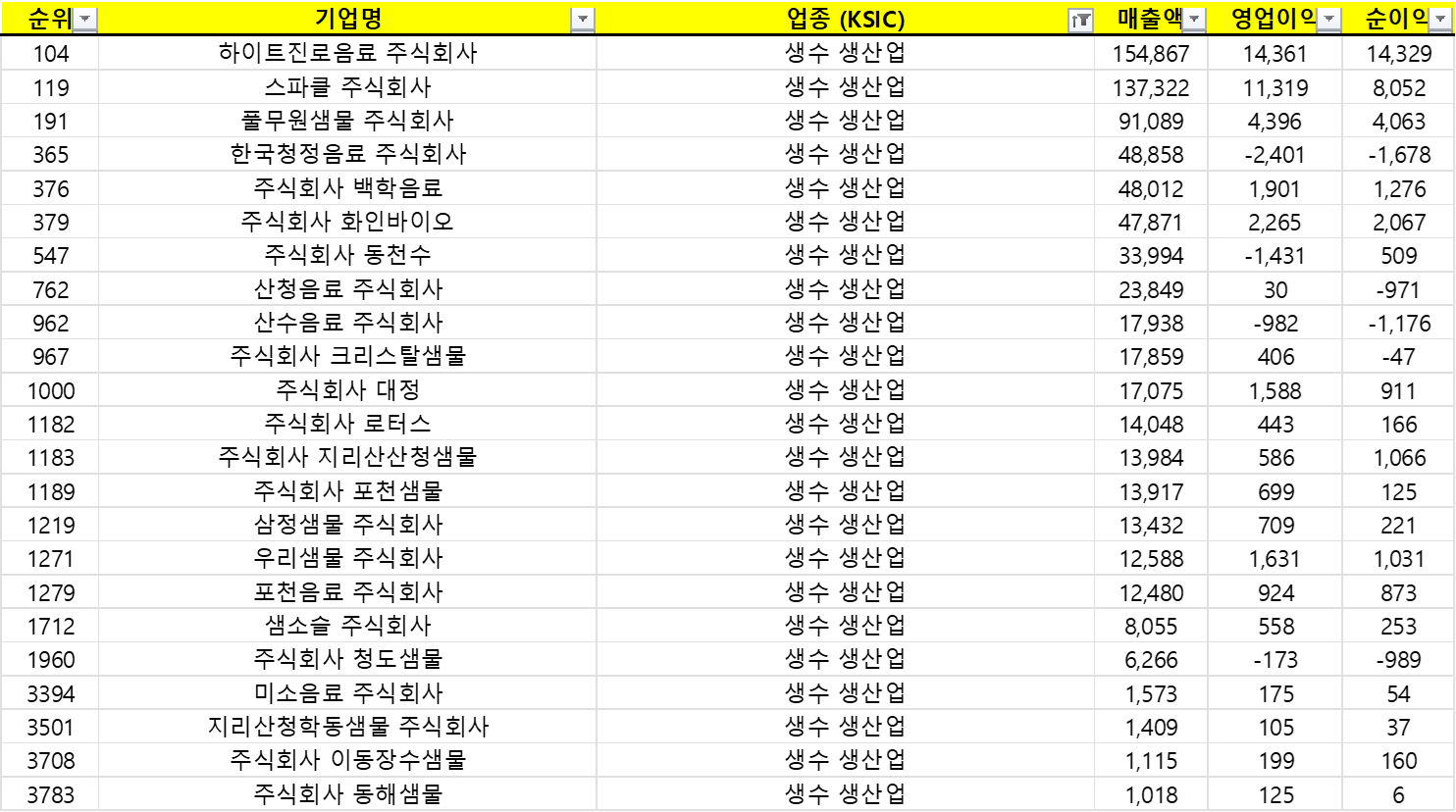 | 104 | 하이트진로음료 주식회사 | 생수 생산업 | 154,867 | 14,361 | 14,329 |