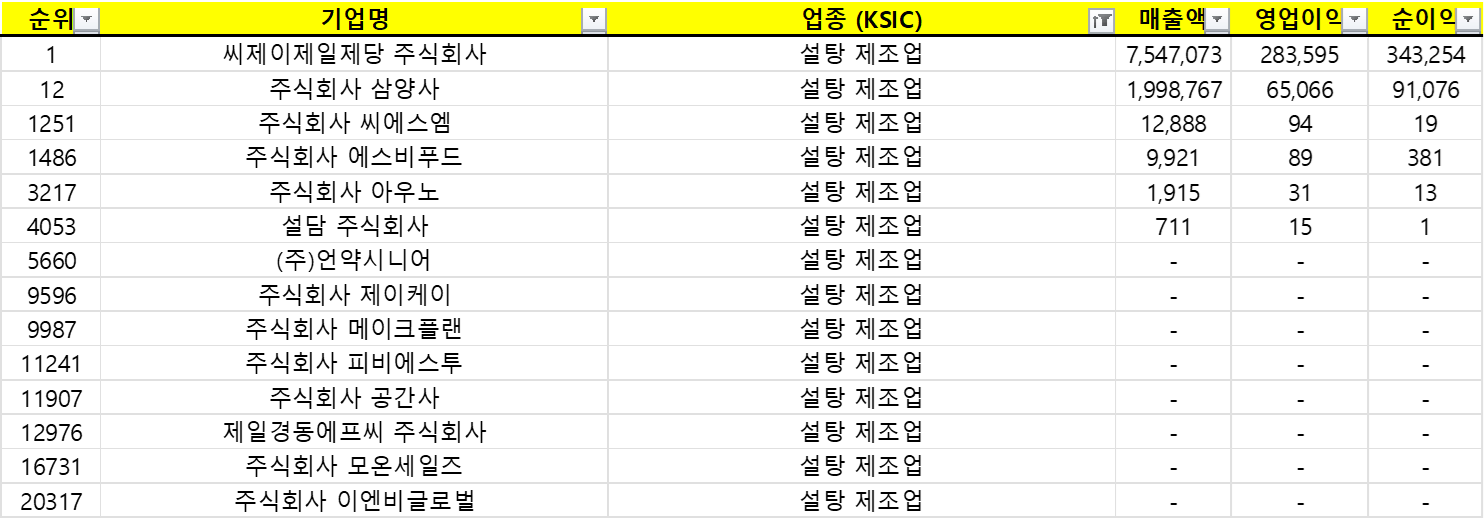 | 1251 | 주식회사 씨에스엠 | 설탕 제조업 | 12,888 | 94 | 19 |