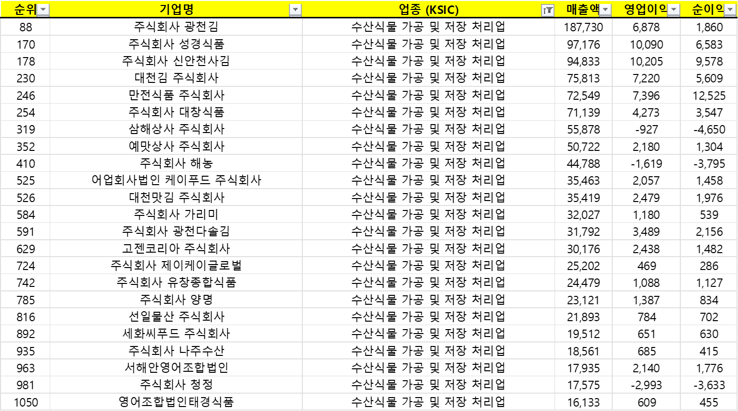 | 1818 | 주식회사 광천원김 | 수산식물 가공 및 저장 처리업 | 7,201 | 455 | 316 |
