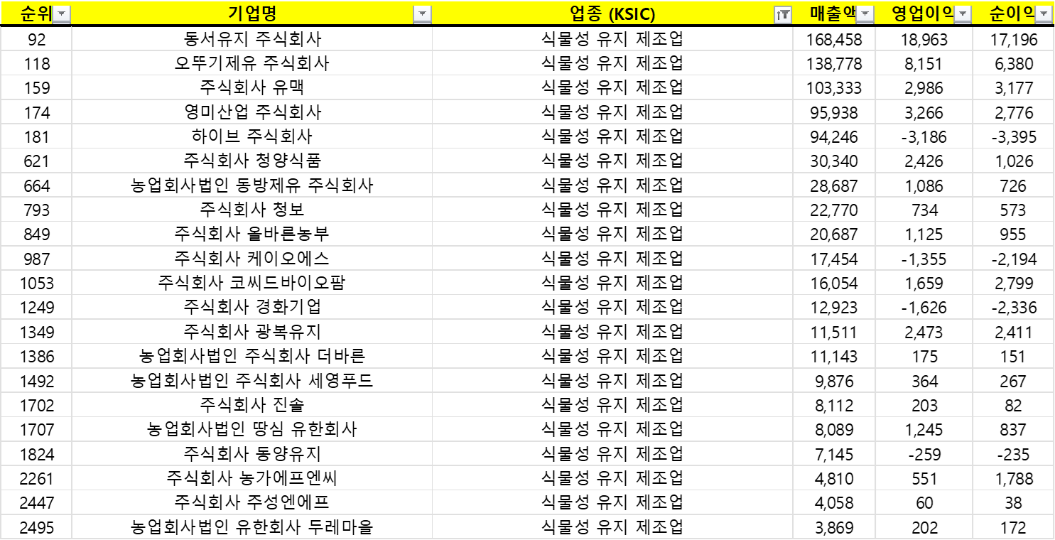 | 2757 | 농업회사법인 황가네 주식회사 | 식물성 유지 제조업 | 3,052 | 120 | 71 |