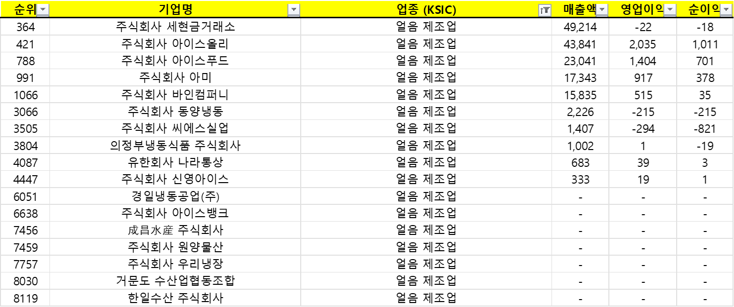 | 991 | 주식회사 아미 | 얼음 제조업 | 17,343 | 917 | 378 |