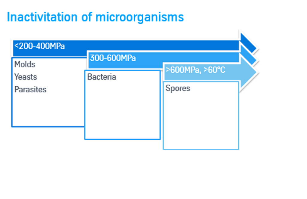 - High Pressure Processing은 액체 또는 고체 식품을 포장하거나, 포장하지 않은 상태로 100~900MPa(Mega Pascal: 1MPa은 약 10기압)의 정수압(Hydrostatic pressure)으로 압력처리하는 것