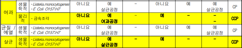 공정명 | CCP | 위해요소 | 위해요인 | 한계기준 |