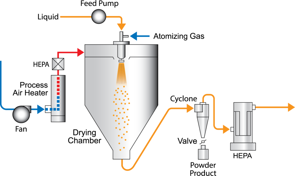 - 액상원료를 미립화 후 표면적을 최대학 확대시켜 열풍 속에 분무하여 수분이 순간적으로 증발, 건조되어 분말이 됨
